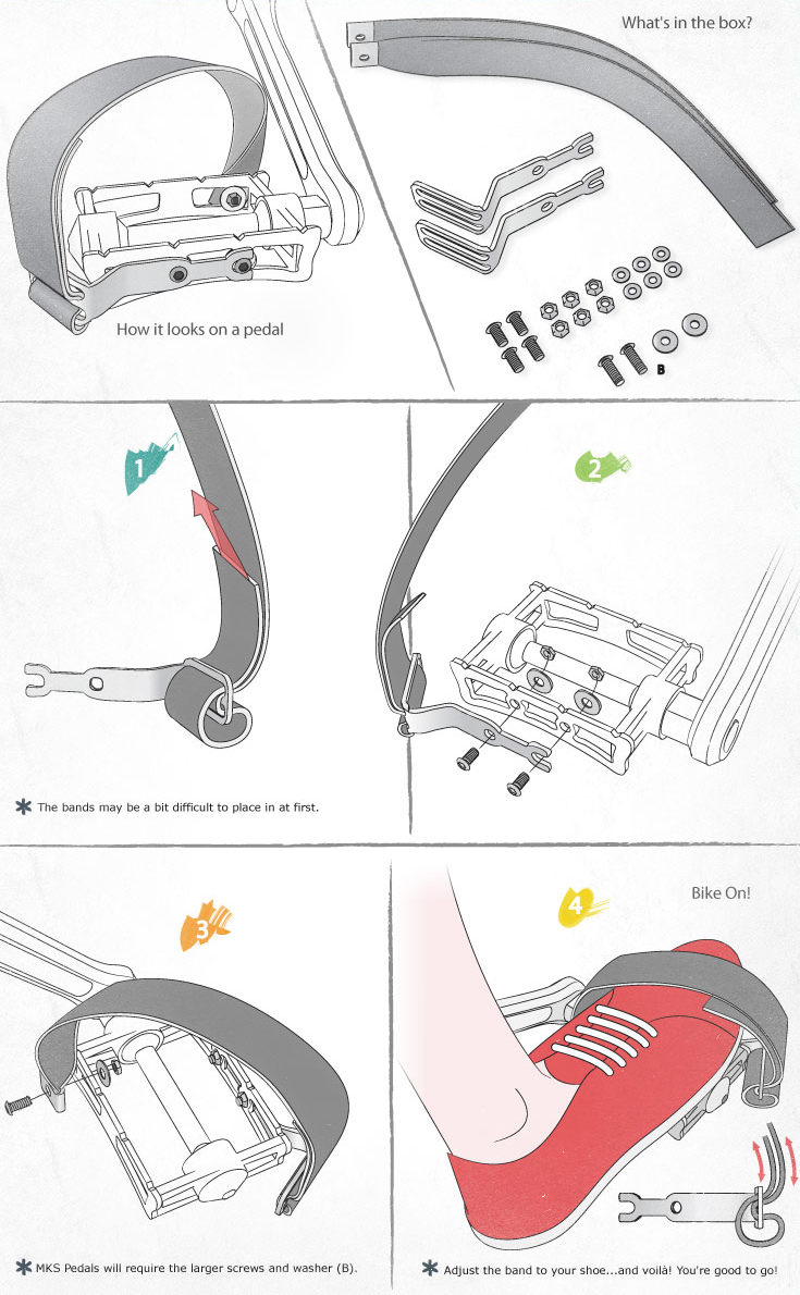 Bicibands fit all standard pedals, for assembling information please check-out the instructions below.